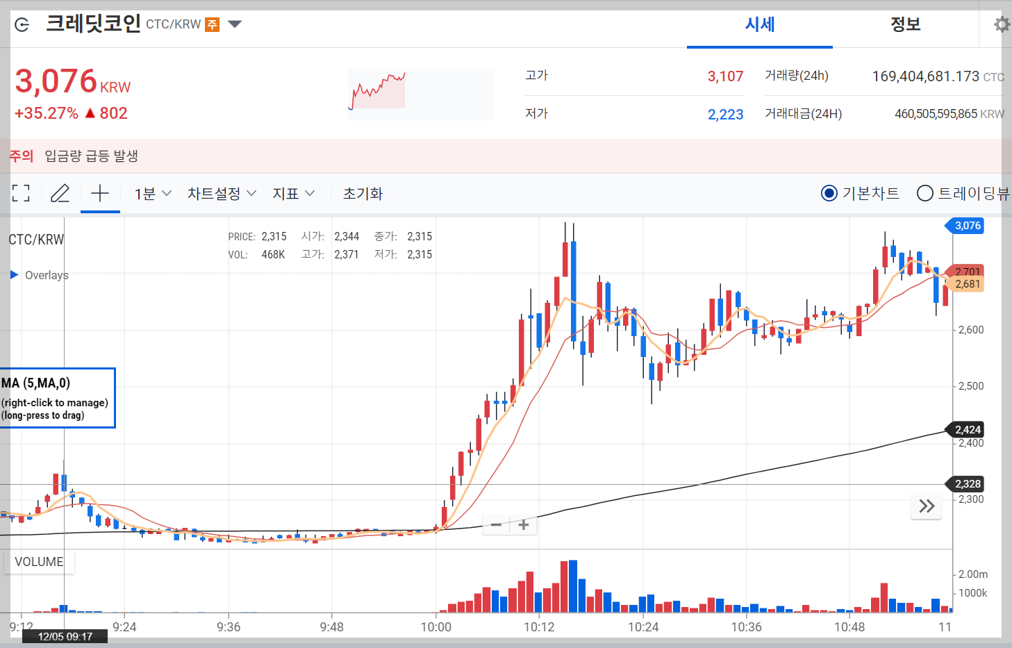 크레딧코인은 5일 이평선을 따라