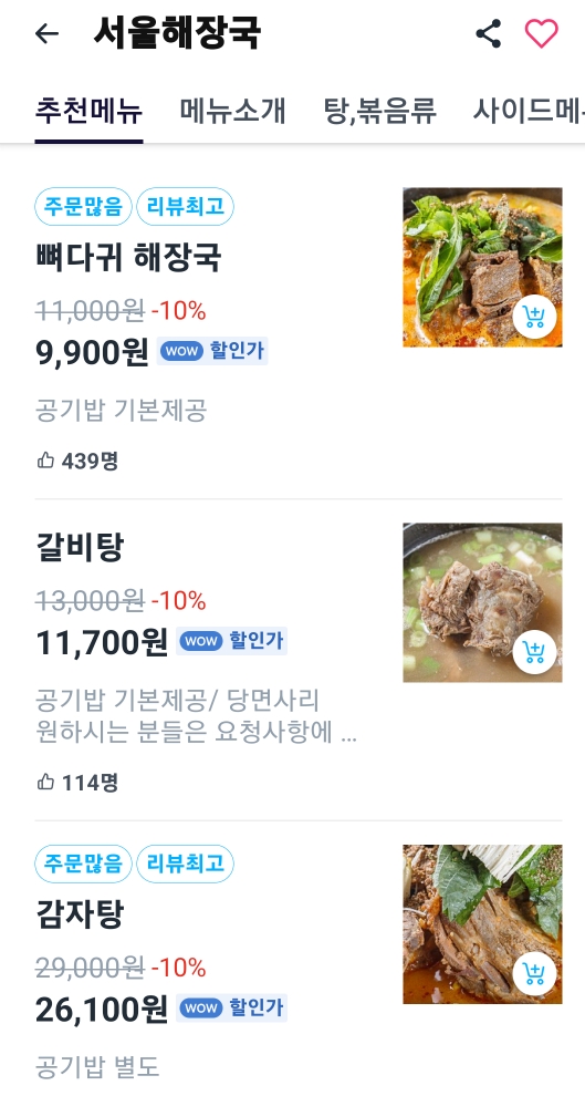 그래도 감자탕이 너무 땡기는 날이라면 배달로 시킬 수 있는 곳은 서울 해장국이란 집인데 리뷰도 가장 많고 의외로 갈비탕도 꽤 인기가 많아 둘다 시켜먹어봤는데
