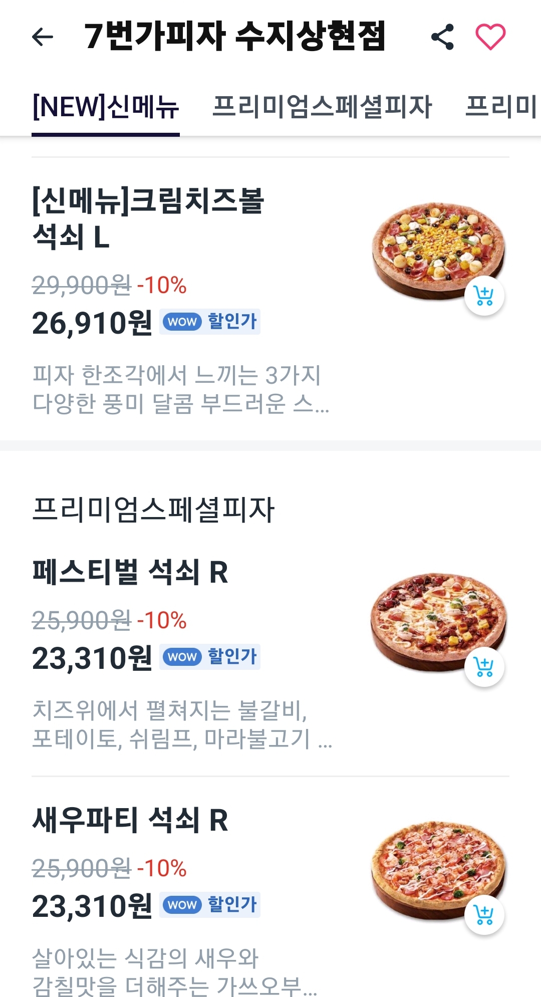 크림피자치즈볼 석쇠 피자랑 새우파티 석쇠 피자를 시켜먹어봤는데